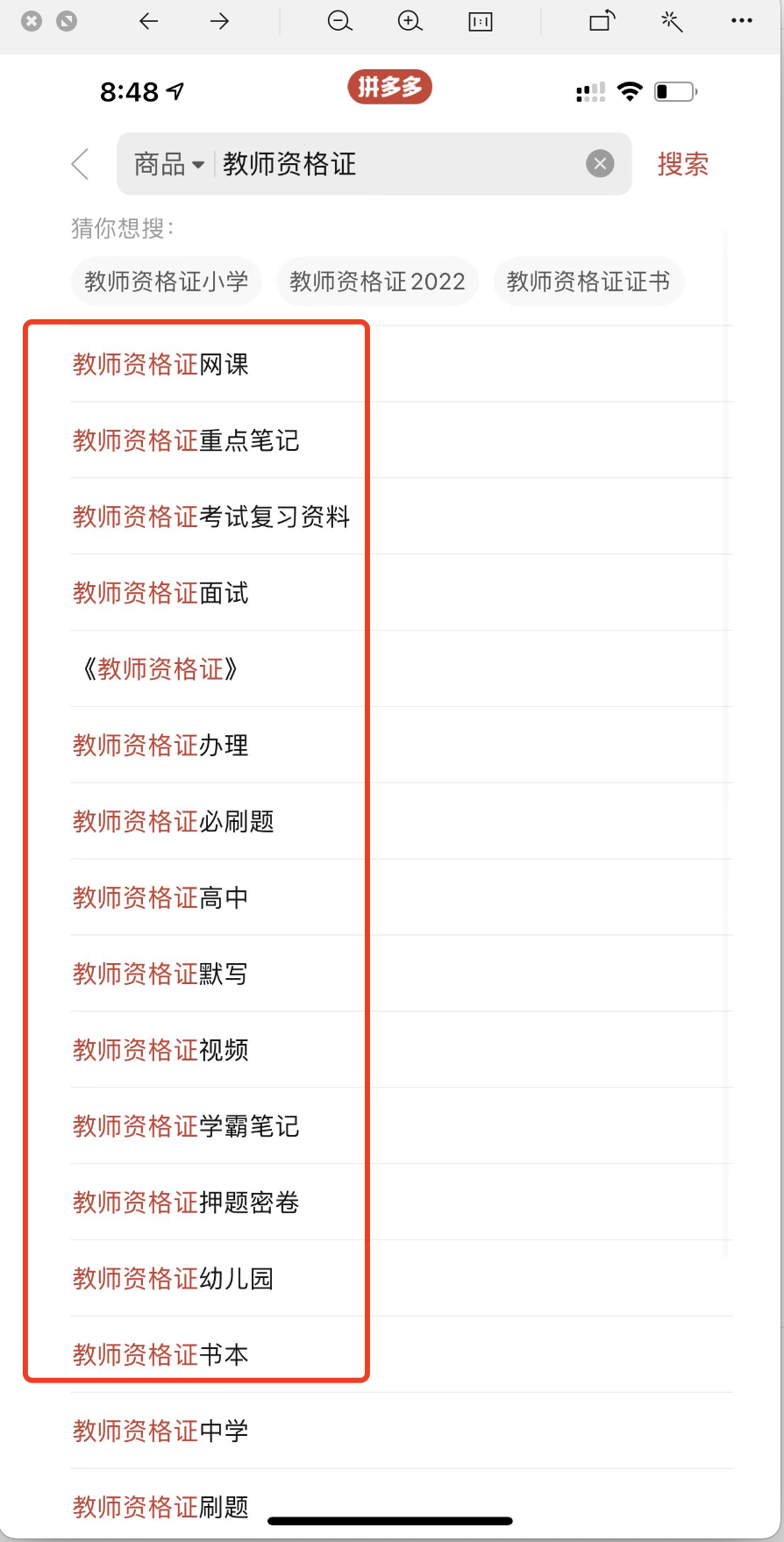 我搜索教师资格证就出这样多关键词,我把这些关键词在拼多多还有就是小红书,甚至是各大平台都去搜索,都去研究,看看别人是如何引流的。卖的是什么,是如何卖的,这个是在电商平台,这里我想说的是在微信里面卖。