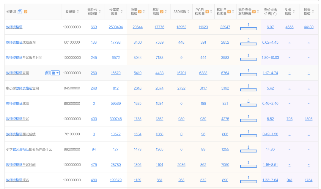 知道关键词以后,就去搜索,比如直接搜索教师资格证,搜索关键词时候同样有很多出来的关键词,我们可以一个个的去看,也可以选择一些量比较大的词,就是大家经常搜索的词。