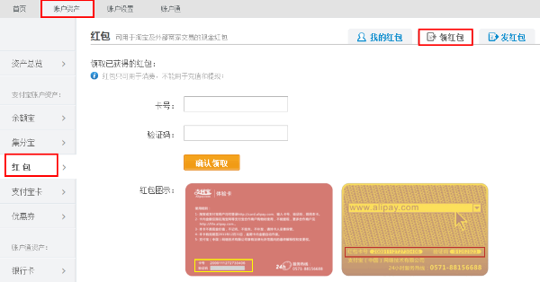 领红包的流程 大文 五月 12, 2016 账户资产 0 条评论 1275 围观 1 登录支付宝账户( www.alipay.com), 点击【账户资产】—【红包】—【领红包】。 2 输入红包卡号(16、18、20位)、8位或15位验证码,点击【确认领取】。