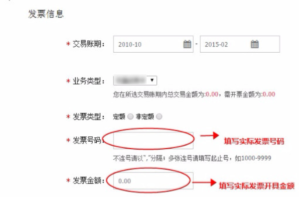 2 填写发票信息。交易账期选择(实开发票金额的账期);业务类型会提示需开票金额;发票号码(请填写完成实开发票号码);发票金额(请填写实开发票金额)。