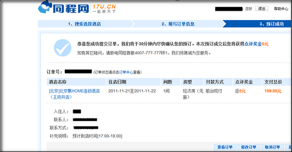 5 提交订单后即可预订成功。在成功入住并离店后的下一周周五前就会获得到相应的集分宝返利。