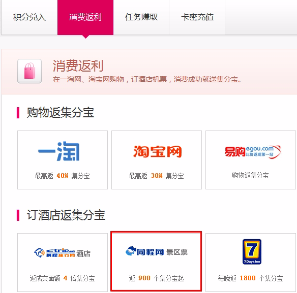 1 用户进入集分宝频道页面,点击【获得集分宝】—【 消费返利】, 可以通过订酒店、订机票、订各类演出票、景点门票及购物的方式获取集分宝返利。