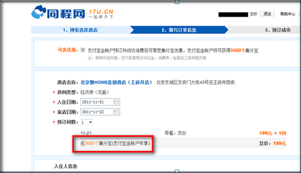 4 确认酒店后填写订单信息,在该页面将提示预订成功后返集分宝的数量。