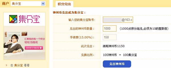 神州运通积分(神州币)兑换集分宝流程 大文 五月 12, 2016 账户资产 0 条评论 1687 围观 1、 100点神州币(积分)=100个集分宝,其中15%的神州币手续费 2、 1000点神州币(积分)起兑,必须为10的整数倍 兑换操作流程 1 进入神州运通网站,兑积分页面,选择商户为【集分宝】。 2 登录神州运通网站。 3 输入集分宝账号(支付宝账户名)和需要兑出的神州币数量,系统会自动计算实际消耗的神州币数量。 4 点击兑出神州币,完成兑换。