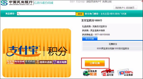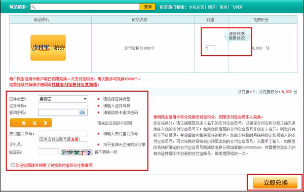 民生银行信用卡兑换集分宝流程 大文 五月 12, 2016 账户资产 0 条评论 1680 围观 1、 使用民生银行信用卡积分兑换支付宝积分,以1000个集分宝起兑,且以1000个的整数倍进行兑换,每次最多可兑换10000个集分宝,每个民生信用卡客户每日仅限兑换一次 2、 民生银行兑换比例:7200个民生积分=1000个集分宝积分 兑换操作流程 1 进入民生银行信用卡积分商城,点击【缤纷礼券】—【支付宝积分】 2 点击【立即兑换】—【快速支付】,进入兑换页面。 3 输入支付宝账号(会绑定),输入银行卡对应的身份证号,点击【立即兑换】; 如要修改所绑定的支付宝账号,需用户联系民生银行信用卡商城客服400-650-5568,并需提供用户本人的有效证件及新的支付宝账号,每季度限修改一次。 4 输入相应的信用卡号和交易密码,点击【确认】进行支付。 5 提示支付成功,点击【支付完成】。 6 支付成功,完成兑换。