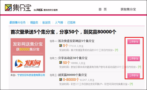 赚集分宝的流程 大文 五月 12, 2016 账户资产 0 条评论 1570 围观 1 进入赚集分宝页面,点击【获取集分宝】—【 任务赚取】。 2 选择想要参加的赚分任务,点击【参加】按钮,进入赚分任务详情页面,点击【立即参加】按钮,登录成功后即可参加赚分任务。 3 成功参加任务后,在指定的时间内将集分宝发放到用户手中。登录【 我的集分宝】,在账户查询里可以看到相应的赚集分宝记录。