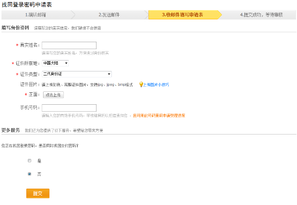 个人账户通过【人工审核】重置登录密码的流程 大文 五月 13, 2016 账户设置 0 条评论 1485 围观 使用前提: 人工服务:系统会向您的支付宝账户邮箱发送一封邮件,您需要根据邮箱提示回答问题或填写相关身份信息,提交后待客服在48小时内进行核实处理 1 登录支付宝服务大厅, 点击【自助服务】—【重置登录密码】 2 输入支付宝账户名和校验码,点击【下一步】 3 选择【通过人工服务】,点击【立即重置】 4 填写联系邮箱,点击【确认并发送邮件】, 若输入邮箱地址时,提示邮箱已经被占用,是由于该邮箱已注册了阿里巴巴集团下的网站账户,如淘宝、支付宝、阿里巴巴网站等,建议更换新邮箱即可 5 进入邮箱查收邮件,若无法收到邮件,请点击重新发送邮件 6 点击对应邮件中的链接, 系统会自动判断,根据邮件提示请您回答问题或上传证件(证件可以用相机或手机拍摄,需清楚。且提交的证件仅供支付宝人工任务审核使用), 如果账户绑定手机无法接收短信,也可以同时一起提交取消手机绑定 7 信息提交成功后,支付宝客服会在48小时内进行审核, 处理结果会通过邮件告知进展,如在受理单中有填写手机号,也会同步发送短信通知