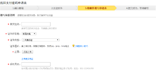 个人账户通过【人工服务】重置支付密码的流程 大文 五月 13, 2016 账户设置 0 条评论 1366 围观 人工服务:系统会向您的支付宝账户邮箱发送一封邮件,您需要根据邮箱提示回答问题或填写相关身份信息,提交后待客服在48小时内进行核实处理 1 登录支付宝服务大厅 点击【自助服务】,登录账户后点击【重置支付密码】 2 选择【通过人工服务】,点击【立即重置】 3 填写联系邮箱,点击【确认并发送邮件】, 若输入邮箱地址时,提示邮箱已经被占用,是由于该邮箱已注册了阿里巴巴集团下的网站账户,如淘宝、支付宝、阿里巴巴网站等,建议更换新邮箱即可 4 进入邮箱查收邮件,若无法收到邮件,请点击重新发送邮件 5 点击对应邮件中的链接, 系统会自动判断,根据邮件提示请您回答问题或上传证件(证件可以用相机或手机拍摄,需清楚。且提交的证件仅供支付宝人工任务审核使用), 如果账户绑定手机无法接收短信,也可以同时一起提交取消手机绑定 6 信息提交成功后,支付宝客服会在48小时内进行审核, 处理结果会通过邮件告知进展,如在受理单中有填写手机号,也会同步发送短信通知