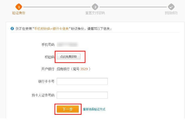 个人账户通过【手机校验码+银行卡信息】重置支付密码的流程 大文 五月 13, 2016 账户设置 0 条评论 1483 围观 使用前提: 手机校验码+银行卡信息:适用于手机号码可以使用,记得银行卡信息(卡号、持卡人证件号) 1 登录支付宝服务大厅, 点击【自助服务】,登录账户后点击【重置支付密码】 2 选择【通过手机校验码+银行卡信息】,点击【立即重置】 3 点击【点此免费获取】后,填写6位数字校验码和需要验证的快捷银行卡信息(账户中签约状态为成功的、签约时间最近的一张快捷银行卡),点击【下一步】 4 设置新支付密码,点击【确定】,设置成功