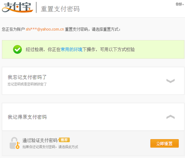个人账户通过【验证原支付密码】重置支付密码的流程 大文 五月 13, 2016 账户设置 0 条评论 1364 围观 前提条件:支付密码未被锁定,记得原支付密码 1 登录支付宝服务大厅, 点击【自助服务】,登录账户后点击【重置支付密码】 2 选择【我记得原支付密码】—【通过验证原支付密码】,点击【立即重置】 3 输入原支付密码验证成功, 设置新支付密码,点击【确定】,设置成功