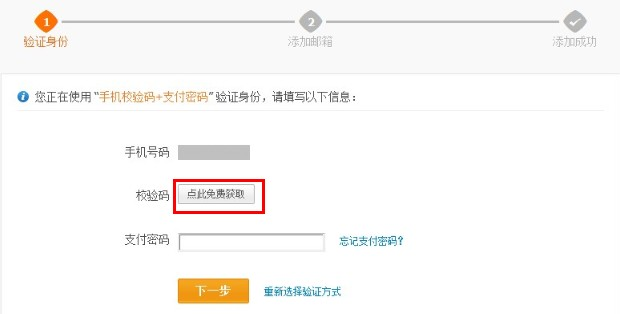 通过【手机校验码+支付密码】添加邮箱登录名的流程 大文 五月 13, 2016 账户设置 0 条评论 1536 围观 1 登录支付宝账户( www.alipay.com), 点击【账户设置】—【基本信息】—【立即添加】 2 选择【手机校验码+支付密码】—【立即添加】 3 点击【点此免费获取】,系统发送校验码到手机,输入校验码、支付密码,点击【下一步】 4 输入要添加的邮箱 温馨提示: 若提示邮箱已经被占用,是由于该邮箱已注册了阿里巴巴集团下的网站账户,如淘宝、支付宝、阿里巴巴网站等,建议更换新邮箱即可 5 点击【立即查收邮件】,到邮箱查收邮件并确认;若要修改邮箱地址,请点击【返回修改】,重新填写新的邮箱 6 查收对应邮件,点击【点此立即激活】即可将Email地址同时作为支付宝账户登录名。可以使用手机号码或邮箱来登录支付宝账户 温馨提示: 如果没有收到邮件、邮箱不对或收到邮件链接无效的,可以登录服务大厅,点击【自助服务】—【修改邮箱名】,按提示修改接收邮件的邮箱