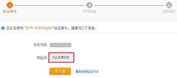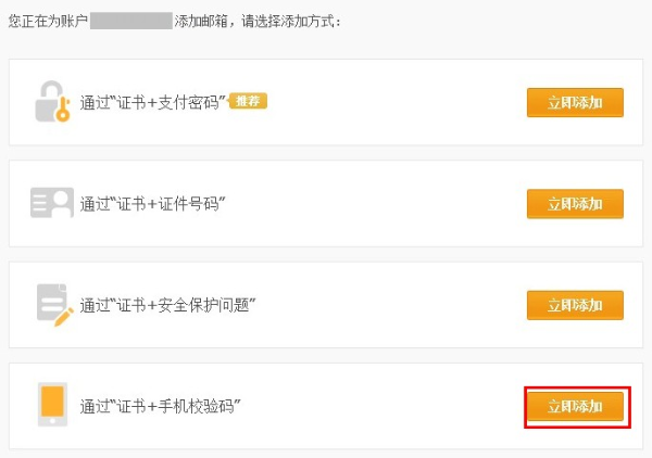 通过【证书+手机校验码】添加邮箱登录名的流程 大文 五月 13, 2016 账户设置 0 条评论 1307 围观 1 登录支付宝账户( www.alipay.com), 点击【账户设置】—【基本信息】—【立即添加】 2 选择【证书+手机校验码】—【立即添加】 3 点击【点此免费获取】,系统会发送校验码到绑定手机, 填写手机收到的校验码,点击【下一步】 4 输入要添加的邮箱 温馨提示: 若提示邮箱已经被占用,是由于该邮箱已注册了阿里巴巴集团下的网站账户,如淘宝、支付宝、阿里巴巴网站等,建议更换新邮箱即可 5 点击【立即查收邮件】,到邮箱查收邮件并确认;若要修改邮箱地址,请点击【返回修改】,重新填写新的邮箱 6 查收对应邮件,点击【点此立即激活】即可将Email地址同时作为支付宝账户登录名。可以使用手机号码或邮箱来登录支付宝账户 温馨提示: 如果没有收到邮件、邮箱不对或收到邮件链接无效的,可以登录服务大厅,点击【自助服务】—【修改邮箱名】,按提示修改接收邮件的邮箱