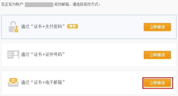 通过【证书+电子邮箱】修改邮箱登录名的流程 大文 五月 13, 2016 账户设置 0 条评论 1422 围观 使用前提: 适用于电脑已经安装证书,邮箱可以收到邮件 1 登录支付宝服务大厅, 点击【自助服务】—【修改邮箱名】 2 选择【通过证书+电子邮箱】,点击【立即修改】 3 系统发送邮件到原来的邮箱,点击【立即查收邮件】 4 打开对应邮件,点击【立即修改邮箱】 5 提示邮箱验证成功,点击【继续修改邮箱】 6 输入新邮箱,点击【下一步】 7 发送邮件到新邮箱,点击【立即查收邮件】 8 进入对应邮件,点击【立即完成修改】 9 提示修改成功