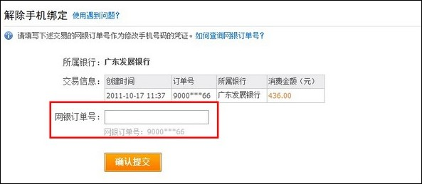通过【网银订单号】解绑手机号码的流程 大文 五月 14, 2016 账户设置 0 条评论 1405 围观 使用前提: 适用于原手机号码无法接收短信,使用邮箱登录的用户,能查询到某笔指定交易的网银订单号 1 登录支付宝账户( www.alipay.com), 点击【账户设置】—【基本信息】 —【手机】—【解绑】 2 选择【通过网银订单号】,点击【立即解绑】 3 输入网银订单号,点击【确认提交】,手机解绑成功