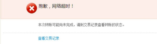 转账付款出现“抱歉,网络超时”,怎么回事? 大文 五月 14, 2016 转账 0 条评论 1903 围观 请您点击【查看交易记录】核实交易状态 , 如显示待付款,且银行卡网银已有扣款成功记录,请不要担心,支付宝会在第二个工作日和银行对账 ; 温馨提醒: 请不要重复创建交易,重复支付,以免带来资金损失 。