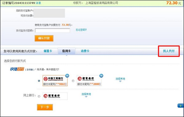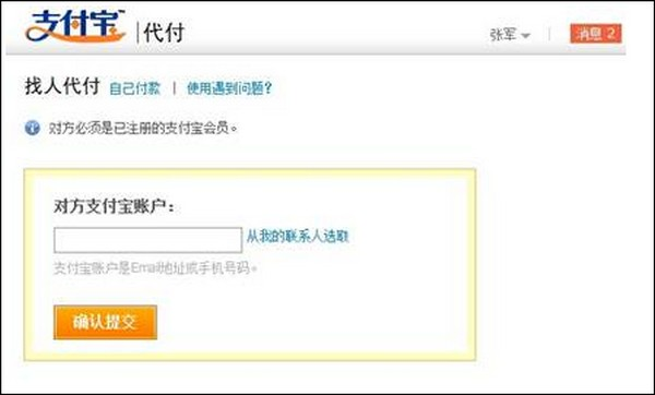 在支付宝签约商家的网站上买东西找人代付的操作流程 大文 五月 15, 2016 转账 0 条评论 1951 围观 1 在支付宝的签约商家下订单后(商家只提供了任一一种付款方式,担保交易或者即时到账交易),支付时选择【支付宝】。到达支付宝收银台后,可以看到【找人代付】选项 2 选择【找人代付】后,出现如下页面 3 点击【立即找人代付】,填写对方的支付宝账户并确认提交,即完成代付申请 4 如果支付宝的签约商家,提供的是2种交易方式(担保交易和即时到账交易),选择担保交易付款时,也可以找人代付。如果选择【即时到账交易】暂时不支持 5 选择【担保交易】,点击【下一步】后进入以下页面 6 点击【找人代付】,即可到达代付申请页,填写代付人的支付宝账户,即可完成代付申请