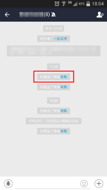 1 在群转账过程中付款中断,在群组对话页会有系统消息“你退出了 快速转账”(仅本人可见),点击【转账】链接还能再次进入该群转账页面,保留上次选人列表;