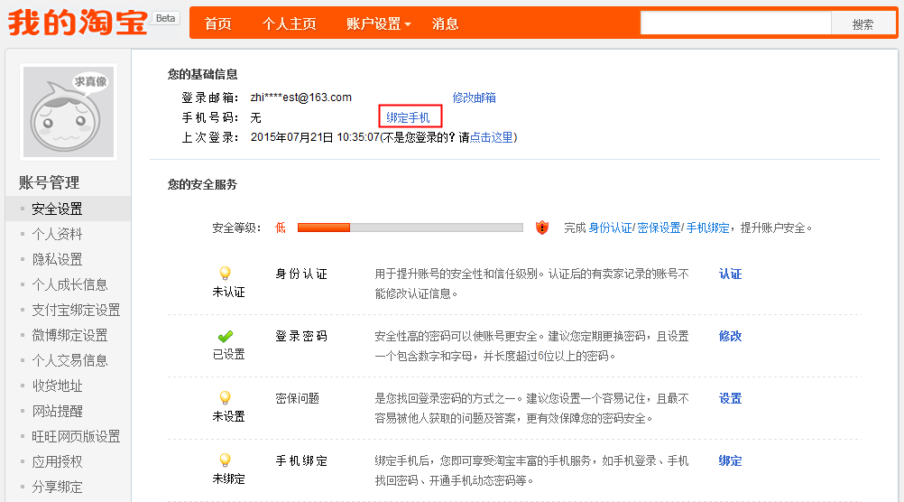 淘宝账号如何绑定手机? 大文 三月 28, 2016 我要开店 0 条评论 2444 围观 登录淘宝账号,点击【 我的淘宝】— 【账户设置】—【安全设置】—【手机绑定】,根据页面提示操作,步骤如下: 第一步:点击 【绑定手机】 第二步:为了保护您的账户安全,需要通过验证,请选择验证方式,点击 【立即验证】。 如您的邮箱停用或收不到验证码,请您点击 【通过人工服务】,申请修改账号绑定手机、邮箱。 如果以上内容未解决您的问题,请点此联系在线客服为您解答。