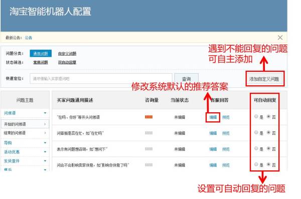 客服回答:对系统默认推荐的回复内容进行编辑修改,编辑完一个问题需要点击保存。子账号经授权后修改内容不会同步到主账号。主账号修改会同步子账号,但不同步之前修改了问题的子账号的这个问题的答案。