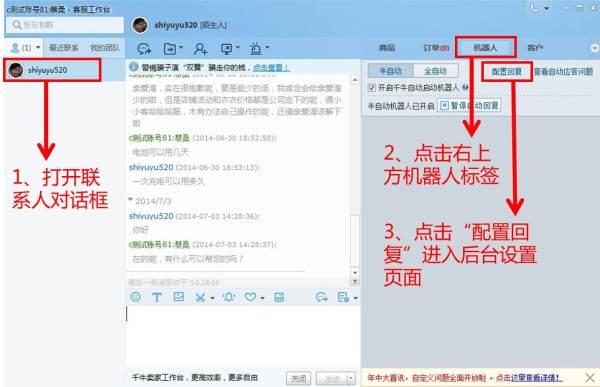 启动千牛>>>左边联系人框随意点击联系人>>>打开框天框后点击窗口右侧机器人标签
