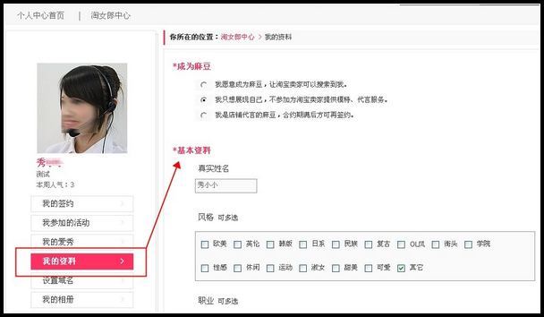 淘女郎申请成功之后,您进入淘女郎页面的“个人中心”—“我的资料”即可进行修改。