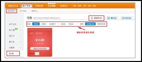 获得的看房红包/购房红包在哪里查询? 大文 五月 20, 2016 垂直市场 0 条评论 1205 围观 麻烦您登录支付宝账户,点击【账户管理】——【红包】——【我的红包】,刷选条件找到您收到的红包,如图所示: