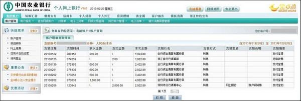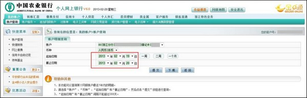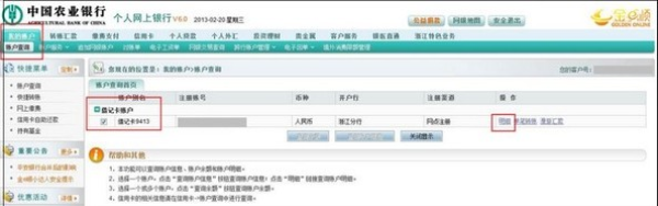农业银行查询交易明细流程 大文 五月 22, 2016 付款方式 0 条评论 1554 围观 1 登录农业银行:http://www.abchina.com/, 点击【我的账户】—【账户查询】,选中要查询明细的账户 2 选择起止日期(可选择一周、二周或者一个月),点击【提交】 3 农业银行网银每页只显示7条记录,点击【后一页】进行查看完整的收支明细