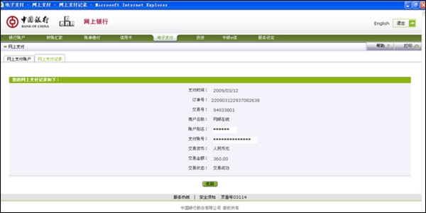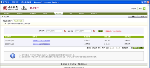 中国银行储蓄卡网银明细流程 大文 五月 22, 2016 付款方式 0 条评论 1424 围观 1 登录中国银行:http://www.boc.cn/, 点击【电子支付】—【网上支付】—【网上支付记录】 2 可查询1年内的【网上支付记录】,查询日期跨度不超过3个月 点击【查询】后,显示查询结果页面:包括支付时间、订单号、交易货币、交易金额、交易状态 3 点击【订单号】后,显示该笔网上支付记录详细信息