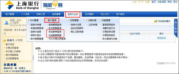 上海银行信用卡如何查询交易记录? 大文 五月 23, 2016 付款方式 0 条评论 1304 围观 1 登录上海银行:http://www.bankofshanghai.com/, 点击【个人网上银行】登录 2 点击【信用卡业务】—【账户查询】—【未出账单查询】或【已出账单查询】查询交易记录