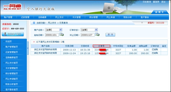 招商银行信用卡(大众版)网银订单号流程 大文 五月 23, 2016 付款方式 0 条评论 1342 围观 1 登录【个人银行大众版】—【信用卡】—【网上支付】—【网上支付交易查询】 2 选择时间段—点击【查询】