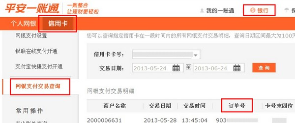 平安银行信用卡如何查询网上支付订单号 大文 五月 23, 2016 付款方式 0 条评论 1260 围观 1 登录平安银行一账通网站:http://one.pingan.com/ 2 点击【银行】—【信用卡】—【网银支付】—【网银支付交易查询】,选择卡号和日期,点【查询】即可显示订单号