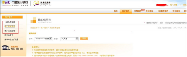 光大信用卡如何查询交易明细? 大文 五月 23, 2016 付款方式 0 条评论 1188 围观 1 登录光大银行:http://www.cebbank.com, 点击【立即登录】 2 点击【账户服务】—【已出账单查询】和【未出账单查询】即可