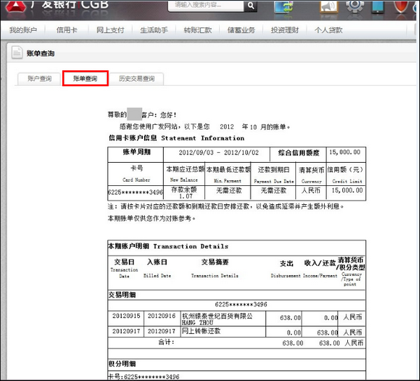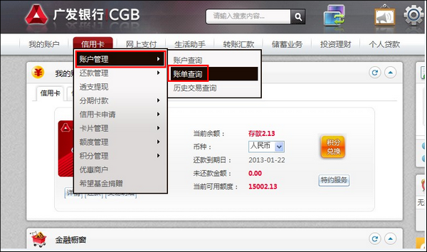 广发信用卡如何查询交易明细? 大文 五月 23, 2016 付款方式 0 条评论 1416 围观 1 登录广发银行:www.cgbchina.com.cn, 点击【信用卡】—【账户管理】—【账单查询】或者【历史交易查询】 2 账单查询页面 3 历史交易查询页面