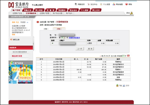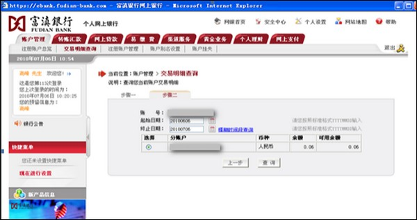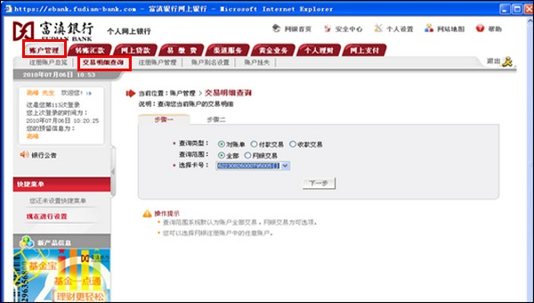 如何查询富滇银行网银的交易明细 大文 五月 24, 2016 付款方式 0 条评论 1648 围观 1 登录富滇银行网站,【账户管理】—【交易明细查询】,选择查询交易范围,选择查询卡号,点击【下一步】 2 选择查询日期(提供一个月、两个月、三个月或者选择查询期间方式) 3 点击【进行查询】