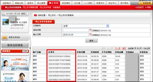 中国邮政储蓄银行查询网上支付订单号方法 大文 五月 24, 2016 付款方式 0 条评论 1646 围观 1 登录邮储银行:www.psbc.com, 点击【网上支付】—【网上支付交易查询】查询网上支付订单号,可根据付款账户、付款日期进行查询。可查询6个月内的交易
