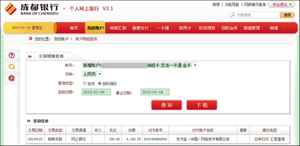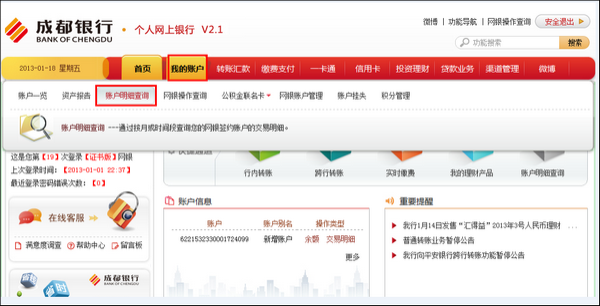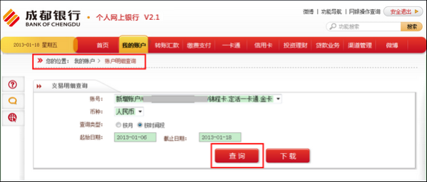 成都银行储蓄卡如何查询网银明细? 大文 五月 24, 2016 付款方式 0 条评论 1854 围观 1 登录成都银行网站—【个人网银登录】—【我的账户】—【账户明细查询】 2 选择账号、时间,点击【查询】 3 交易明细页面