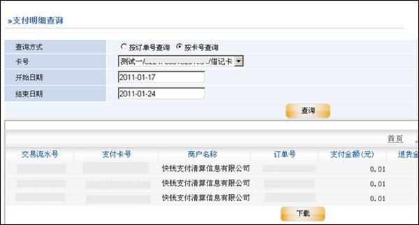 2 在查询方式中,点击【按卡号查询】,选择【卡号】,【开始日期】与【结束日期】进行查询,可查询一年以内的网上支付明细,每次提交查询的时间跨度不能超过三个月,并可将查询结果下载保存
