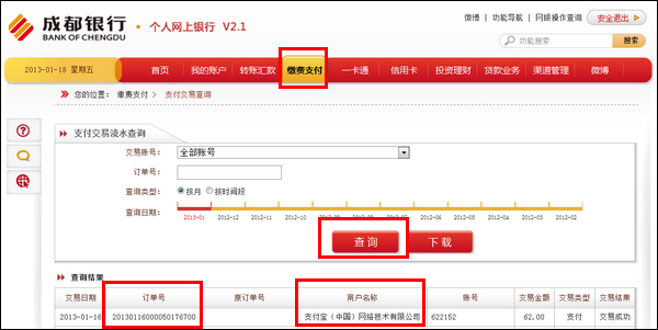 成都银行如何查询网上支付订单号? 大文 五月 24, 2016 付款方式 0 条评论 1303 围观 1 登录成都银行网站:http://www.bocd.com.cn, 选择个人网银登录,点击【缴费支付】—【支付交易查询】—【选择付款账号】,选择具体日期,点击【查询】