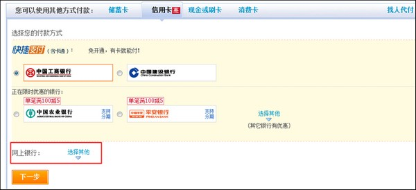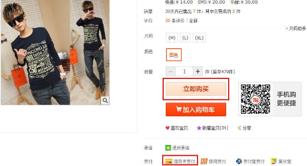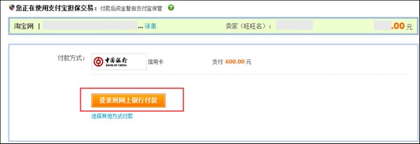大额信用卡支付的操作流程 大文 五月 24, 2016 付款方式 0 条评论 1530 围观 1 在淘宝网上找到支持大额信用卡支付的商品 2 点击【立刻购买】填写地址和购买的信息后,进入收银台进行付款,选择【信用卡付款】 3 确认无误,登录网上银行进行付款