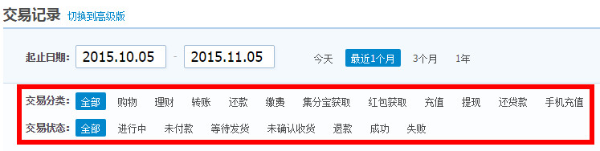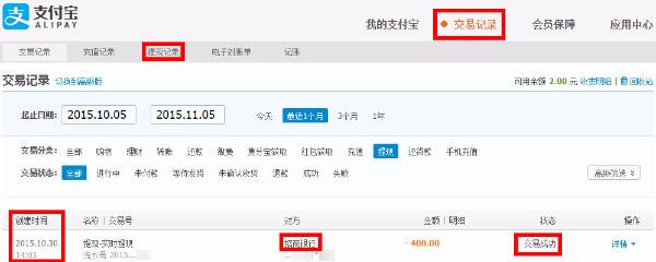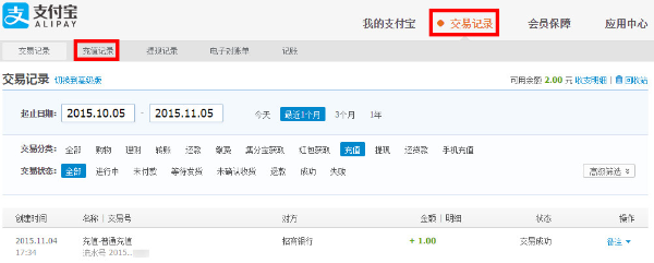 交易记录使用介绍 大文 五月 24, 2016 付款方式 0 条评论 1478 围观 1 【交易记录】下可以查看【交易记录】、【充值记录】、【提现记录】、【电子对账单】、【记账】的详情 点击【交易记录】,可查看账户中所有交易信息 2 点击【交易记录】—【提现记录】,可查看所有提现信息,包括提现申请时间、银行、金额和到账时间 3 点击【交易记录】—【充值记录】,可查看充值金额、时间、银行 4 点击【交易记录】,还可查看【电子对账单】和【记账】等信息