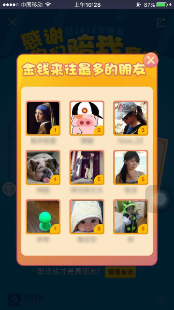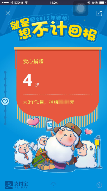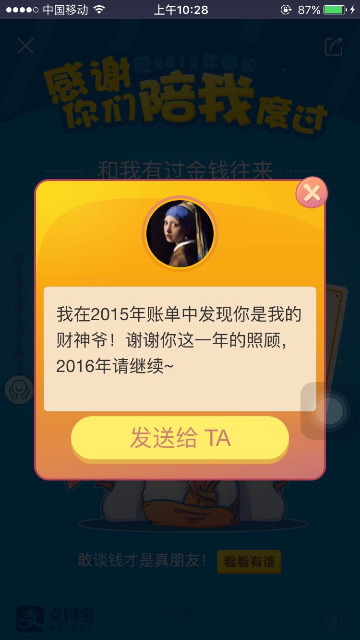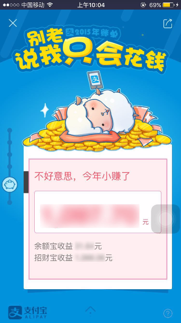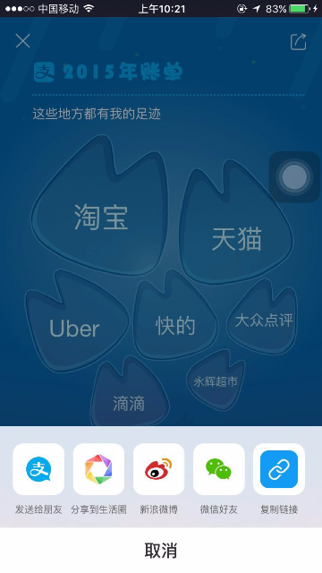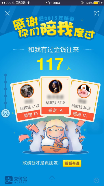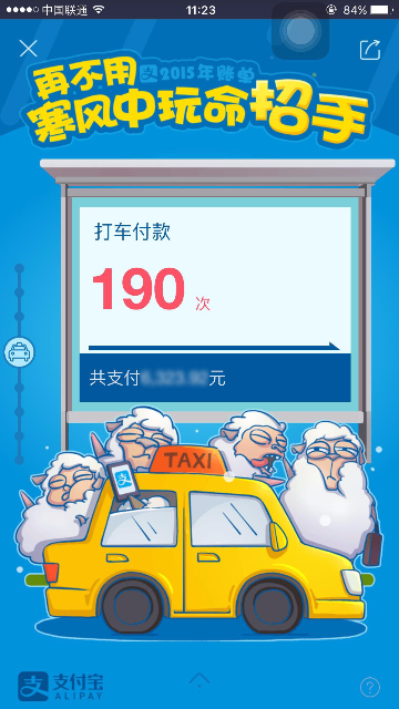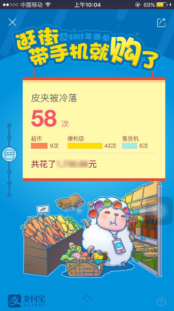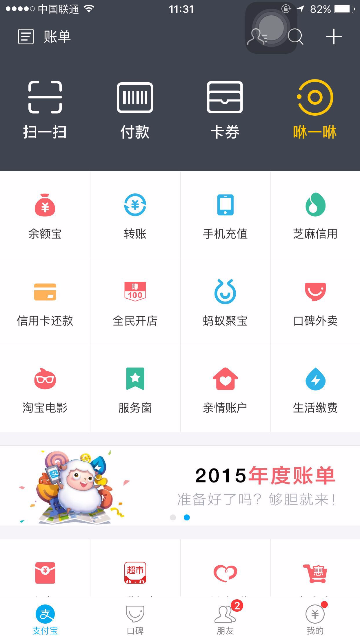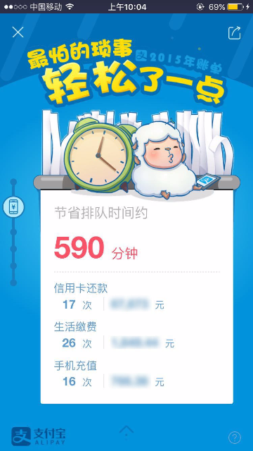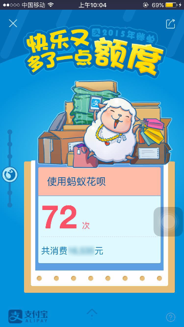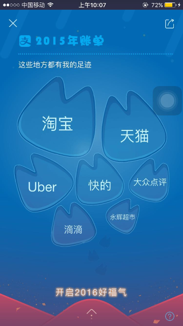 2015年度账单入口及页面展示 大文 五月 24, 2016 付款方式 0 条评论 1574 围观 一、入口 2015年度账单电脑端上线:电子对账单—底部页面展示;我的支付宝—底部页面展示;应用中心/我的服务 —顶部页面展示 用户点击后用支付宝客户端扫描页面二维码,在手机端查看2015年度账单 支付宝客户端9.1及以上版本:可在腰封广告栏,账单顶栏,搜索输入“账单”相关关键字来查看2015年度账单 二、页面展示 1 首页年度账单入口 2 首屏 3 餐饮 4 生活缴费 5 商超便利 6 花呗 7 理财收益 8 金钱往来 9 打车 10 爱心捐赠 11 生活达人 12 消费去向 13 消费足迹 14 春节预告 15 分享 16 金钱往来,看看有谁-金钱和我有金钱往来的人 17 金钱往来-发感谢