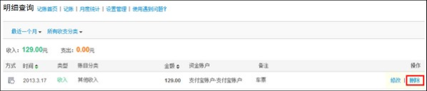 如何删除某条账目? 大文 五月 24, 2016 付款方式 0 条评论 1653 围观 1 登录支付宝账户( www.alipay.com), 选择【全部账单】进入交易记录页面,点击【记账】—【明细查询】,找到具体的记账条目,点击右侧的【删除】即可