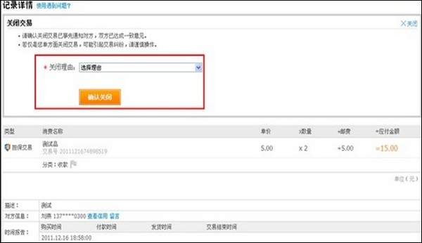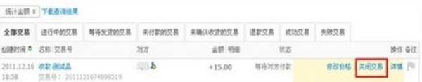 卖家关闭交易操作流程 大文 五月 24, 2016 交易规则 0 条评论 1669 围观 温馨提示: 1) 即时到账交易没有关闭交易的入口,自交易创建起15天后系统将自动关闭交易 2) 担保交易状态为【等待买家付款】时,卖家可以在【交易记录】操作关闭交易;或者自创建交易起7天后,系统自动关闭交易 1 卖家在【交易记录】中找到需要关闭的交易,点击【关闭交易】 2 选择关闭理由,点击【确定关闭】 3 页面弹出提醒框,确认关闭本次交易