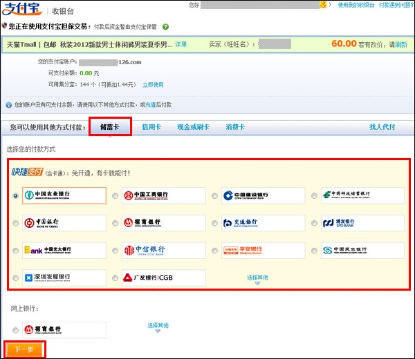 1 选择需要付款的交易—【付款】—选择【储蓄卡】—【快捷支付(含卡通)】—选择银行卡进行支付