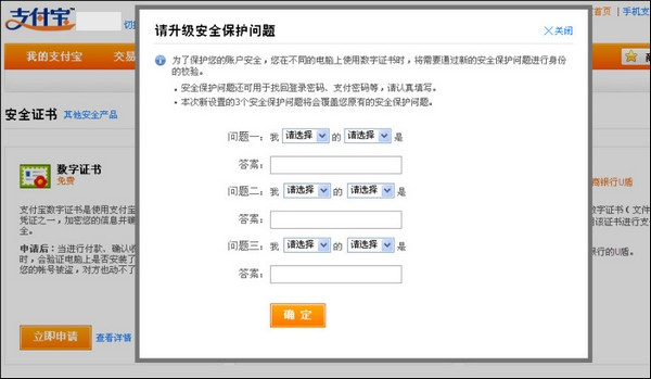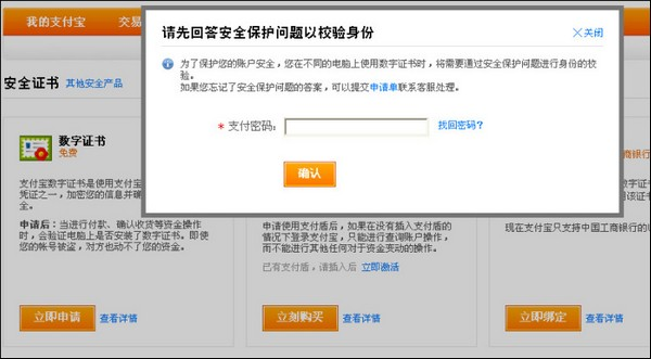1 登录支付宝账户( www.alipay.com), 点击【安全中心】—【安全管家】—数字证书【申请】
