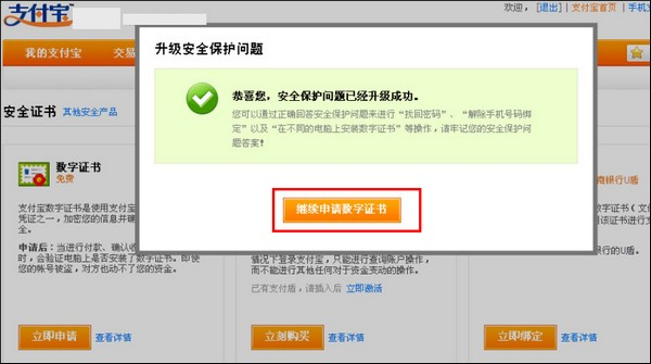 6 安全保护问题升级成功之后,点击【继续申请数字证书】