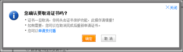 如何自主取消数字证书? 大文 五月 26, 2016 安全中心 0 条评论 1517 围观 自主取消证书的前提:数字证书正常 1 登录支付宝账户( www.alipay.com), 点击【安全中心】—【安全管家】—数字证书【管理】 2 点击【取消数字证书】 3 选择取消数字证书的原因,点击【下一步】 4 点击【确定】即可取消