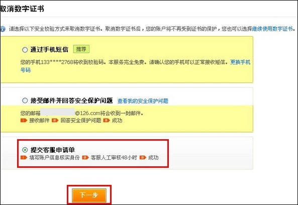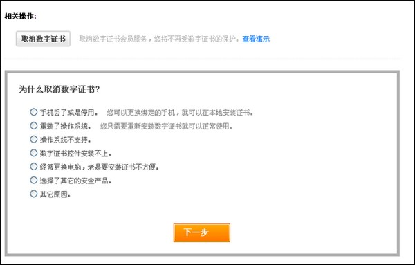 3 选择取消数字证书的原因,点击【下一步】