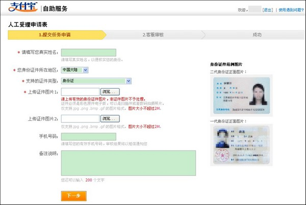 1)如果是个人类型的支付宝账户,请用户上传正面身份证彩色原件扫描件;