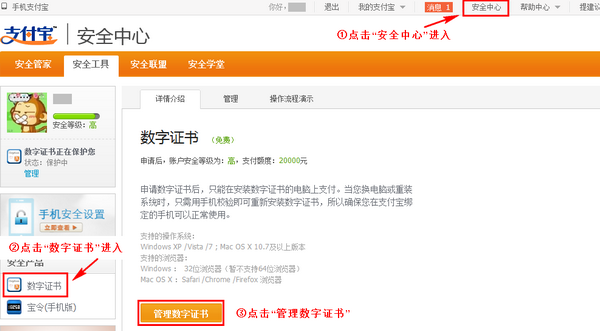 如何查看支付宝数字证书? 大文 五月 26, 2016 安全中心 0 条评论 1671 围观 1 登录支付宝账户( www.alipay.com) 点击【安全中心】—【安全管家】—数字证书【管理】 2 进入到证书管理页面,这里您可以查看您的证书状态